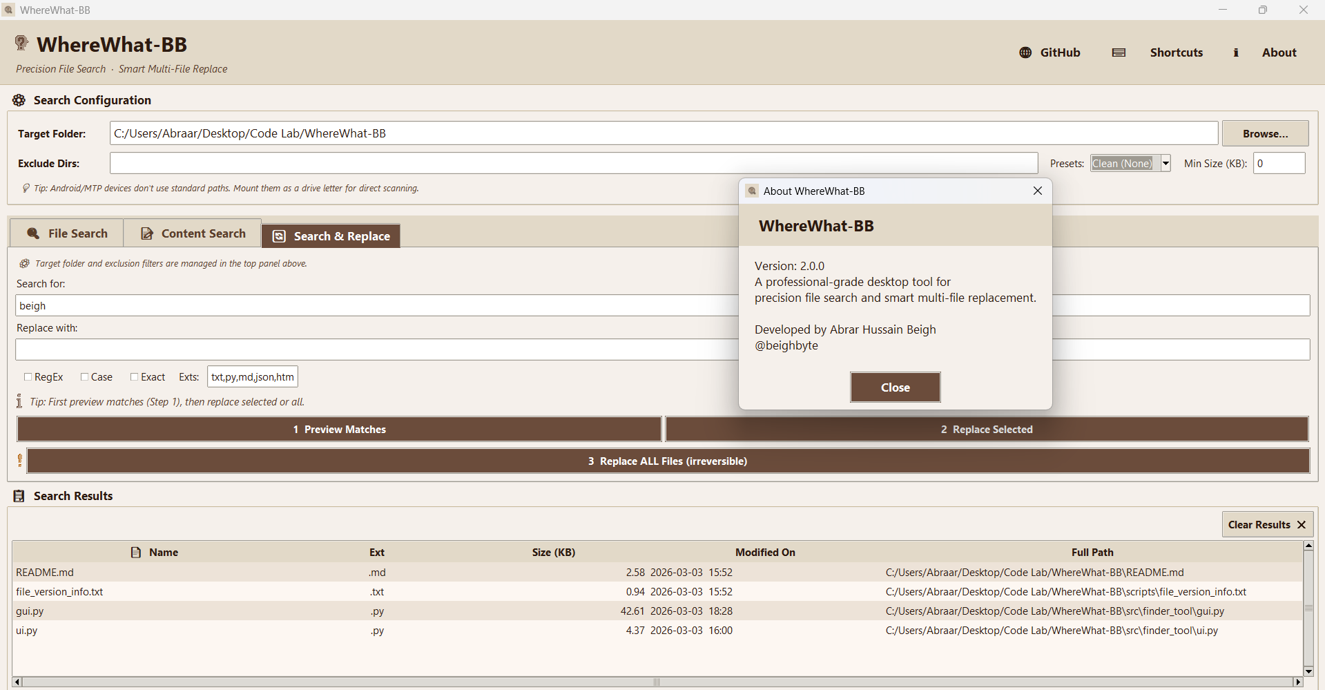 High-performance desktop search & multi-file text replacement utility for Windows.